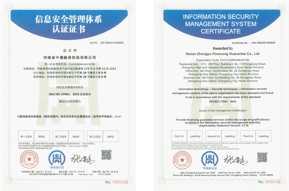 近日,河南省中豫融資擔保有限公司(簡稱“公司”)正式通過質量管理、信息安全管理、業務連續性管理審核評定,獲ISO90001質量管理體系、ISO27001信息安全管理體系和ISO22301業務連續性管理體系等三項體系標準認證證書,昂揚奮進地打開2024年新局面。